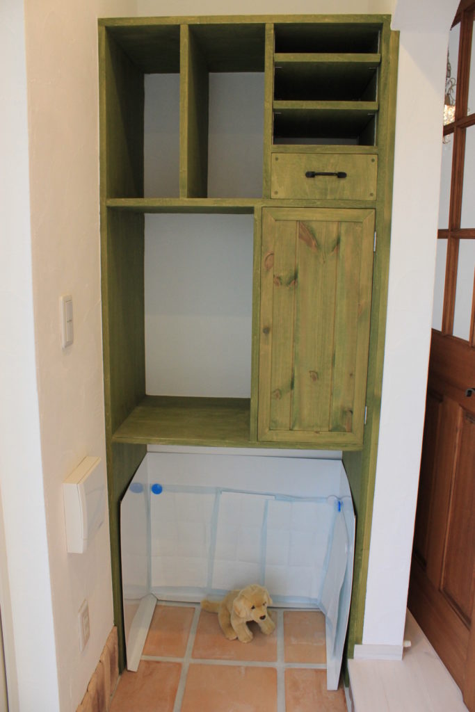 ニッチの下のスペースと造作家具の前にワンちゃんのダイニングスペース!?を作りました