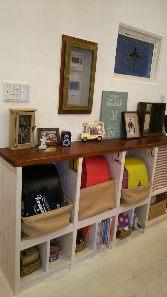 リビングの収納です。子どもたちのランドセルや学校用具は、各部屋ではなくリビングに学校のロッカーのようなイメージで作りました。私がひとりひとりの宿題や明日の準備を見るのも一度にできるので楽になりました。子どもたちが勉強するのも主にダイニングですね。
