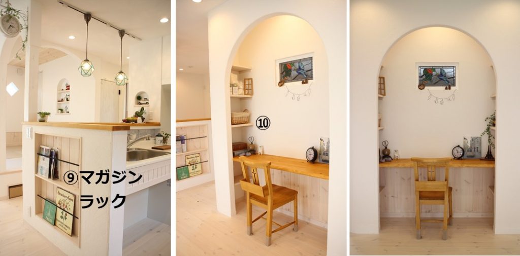 マガジンラックとカウンター机(正面から棚が見えない工夫は施主さまのアイディア!)