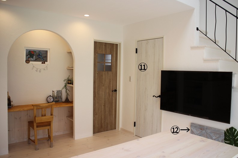 階段下収納(壁掛けTVの配線もこの中に収納)⑫はTvにつながるデッキ類 (階段下のスペースは広さと奥行きがあるので大型の物や掃除機を立てたまま収納できます)