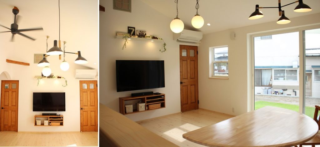 家族みんながTVを見れる半円のダイニングテーブルは「あいの家」オリジナル。