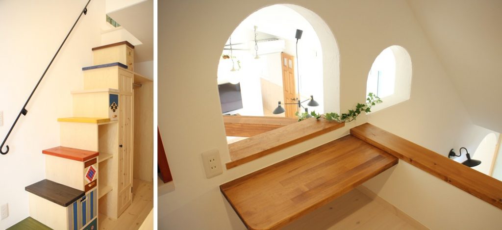 4. 箱階段を上るとリビングを見下ろせるオープンな書斎コーナーとご夫婦それぞれの趣味の部屋。