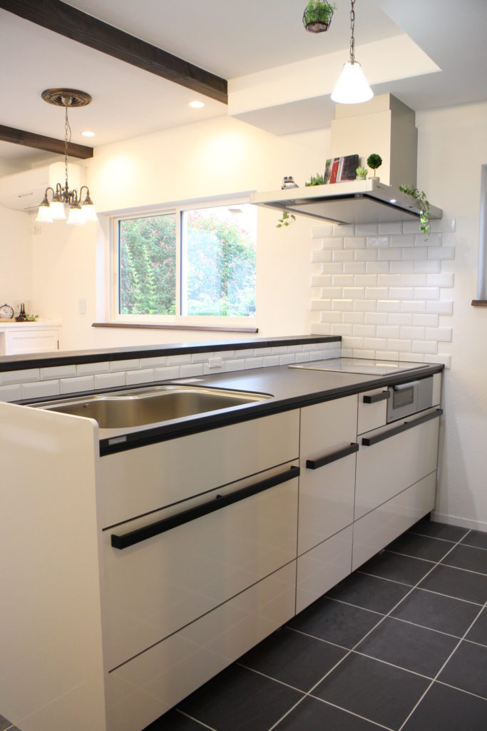 キッチンの床の一部にタイルを使用しています。これは水ハネを考慮した奥様の希望と聞いています。無垢材の床の色とも合っており、よりオシャレに感じます。