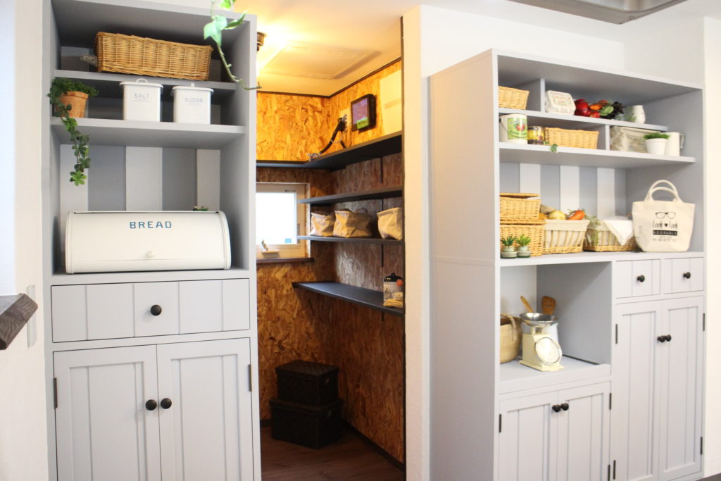 基本的に漆喰・ウール断熱材・リボス塗料を標準仕様としていますが、お客様の要望によって変更は可能です。今回パントリーや階段下の収納スペースの壁にはOSBボードを使っています。これは以前、岡部の内覧会で将来ボクシング教室を開きたいというおうちの内覧会を行ったとき、「この壁をどこかに使いたい」との要望で使用しました。