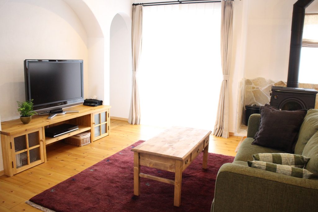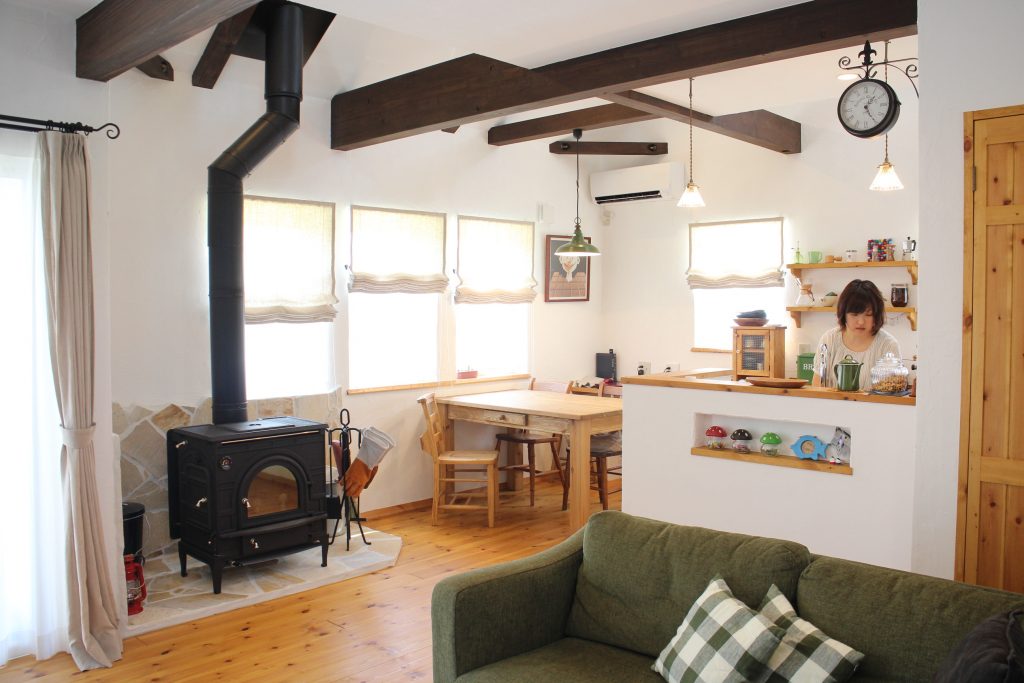 福島市飯坂のOさん邸は、ヨーロッパの田舎街にあるようなおしゃれな外観が印象的な家。リビングには大きな吹き抜けと薪ストーブがあり、窓から射し込む太陽の光と相まって、全体が明るく、暖かい空気に包まれています。ダーク調の見せ梁とアルコーブがアクセントとなり、かわいいインテリアでコーディネートされたおうちです。