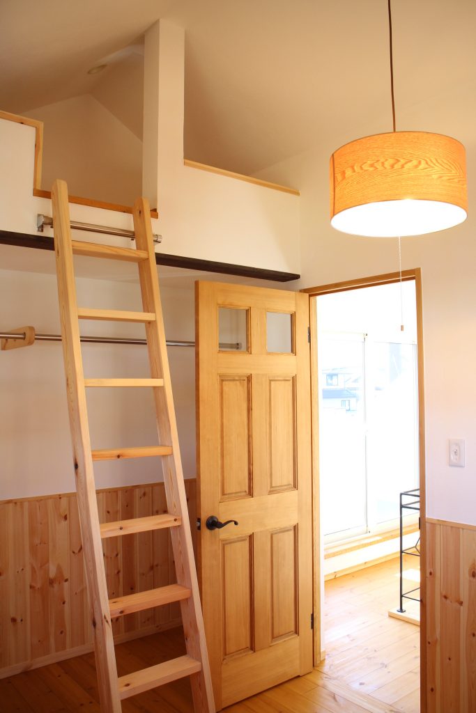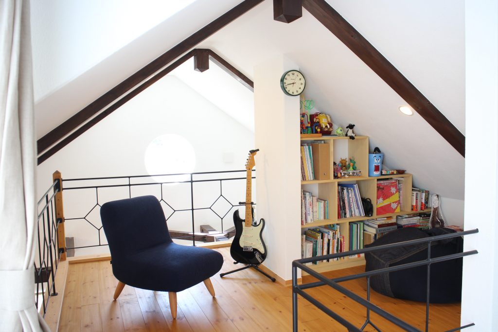 三角屋根の傾斜を生かした2階の廊下部分はセカンドリビングに。吹き抜けで1階とのつながりもあります。今はここは夫の趣味スペースになっています。2つの子ども部屋は大きなロフト付きで、荷物を収納するのに便利です。子どもたちも自分の部屋を自由にコーディネートして楽しんでいるようです。