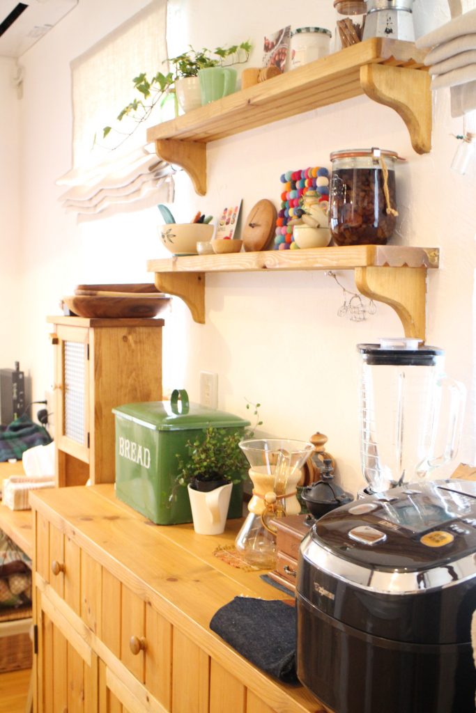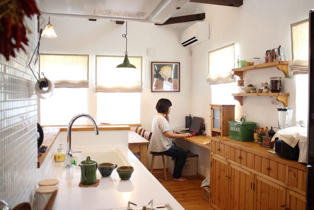キッチンです。ここに立っていると、家全体がよく見渡せるところが良いですね。システムキッチンや収納棚をウッド調で統一したり、好きな雑貨を棚に飾って好きなものに囲まれているのでなんだか幸せな気持ちになります。また、キッチン脇にカウンターを設けて、私のスペースにしています。家事の合間に書き物をしたり調べものをしたりできて便利です。