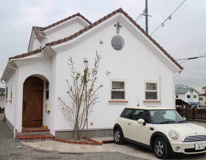 福島市飯坂のOさん邸は、ヨーロッパの田舎街にあるようなおしゃれな外観が印象的な家。リビングには大きな吹き抜けと薪ストーブがあり、窓から射し込む太陽の光と相まって、全体が明るく、暖かい空気に包まれています。ダーク調の見せ梁とアルコーブがアクセントとなり、かわいいインテリアでコーディネートされたおうちです。