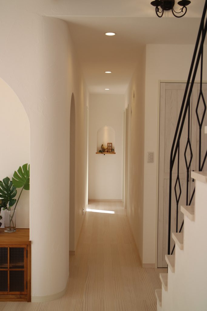 すべてにアールの下がり壁を施工。特にTV台の壁は柔らかなカーブの壁がかわいい!玄関ホールのガラスブロックから差し込む光の影や、既製品の洗面台だけど立ち上がりの壁にタイルを貼ったり‥